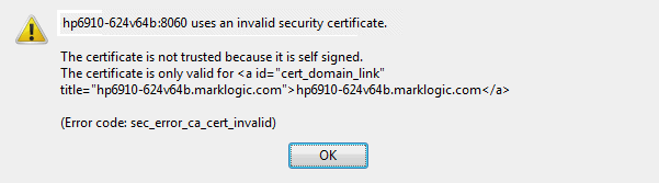 If you have not imported the MarkLogic certificate authority into your Firefox browser, when you first access an SSL-enabled server, you will receive an error notifying you that you have accessed an untrusted server. You can bypass this security exception by accepting the certificate. For example, if you enabled SSL on the HTTP server, App-Services, you can accept the self-signed certificate as described below.
