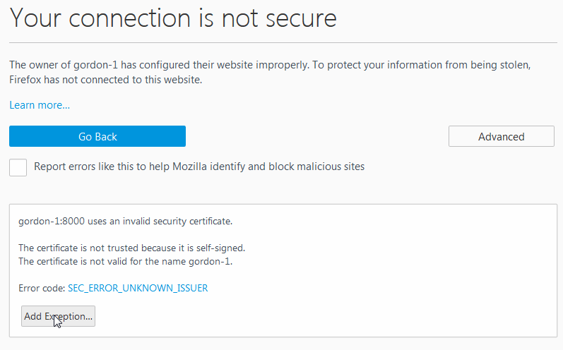 When using Mozilla Firefox, you may encounter an error message that does not allow you the option to add an exception for the self-signed certificate. This type of error looks like: